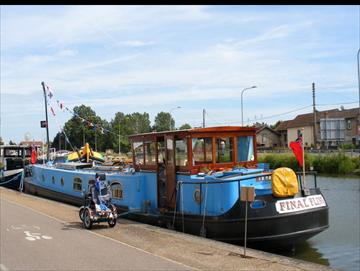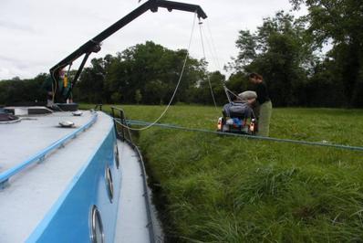 barge “Final Fling” used to lift a mobility scooter onto the shore in France. |